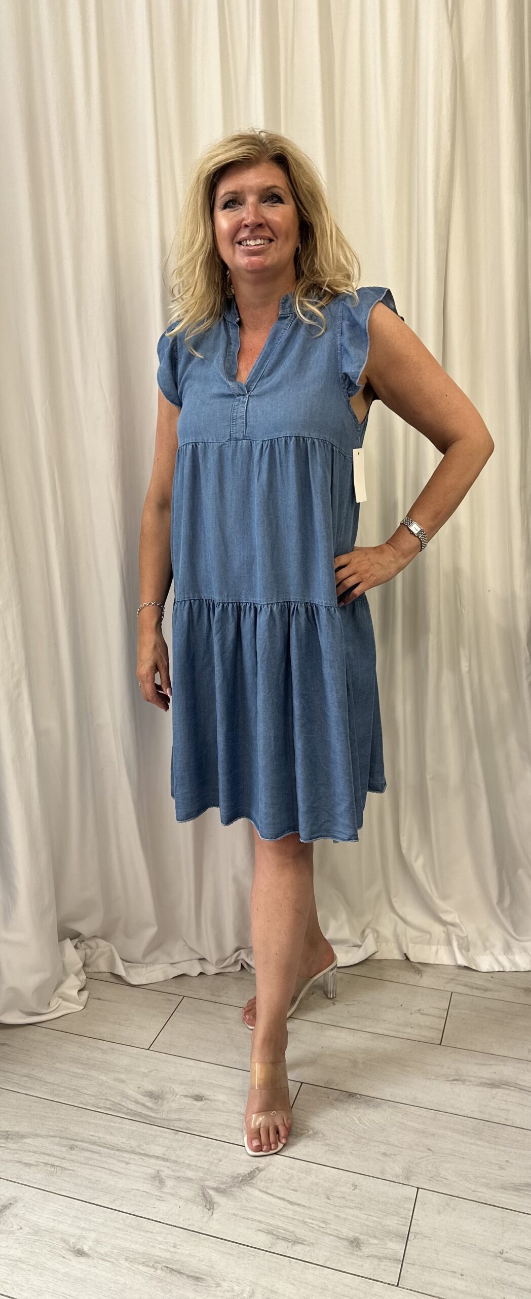 100% Tencel Denim V Neck Frill Tunic Dress