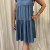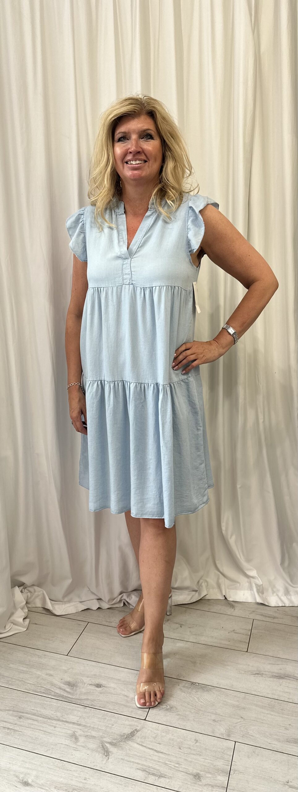 100% Tencel Light Denim V Neck Frill Tunic Dress
