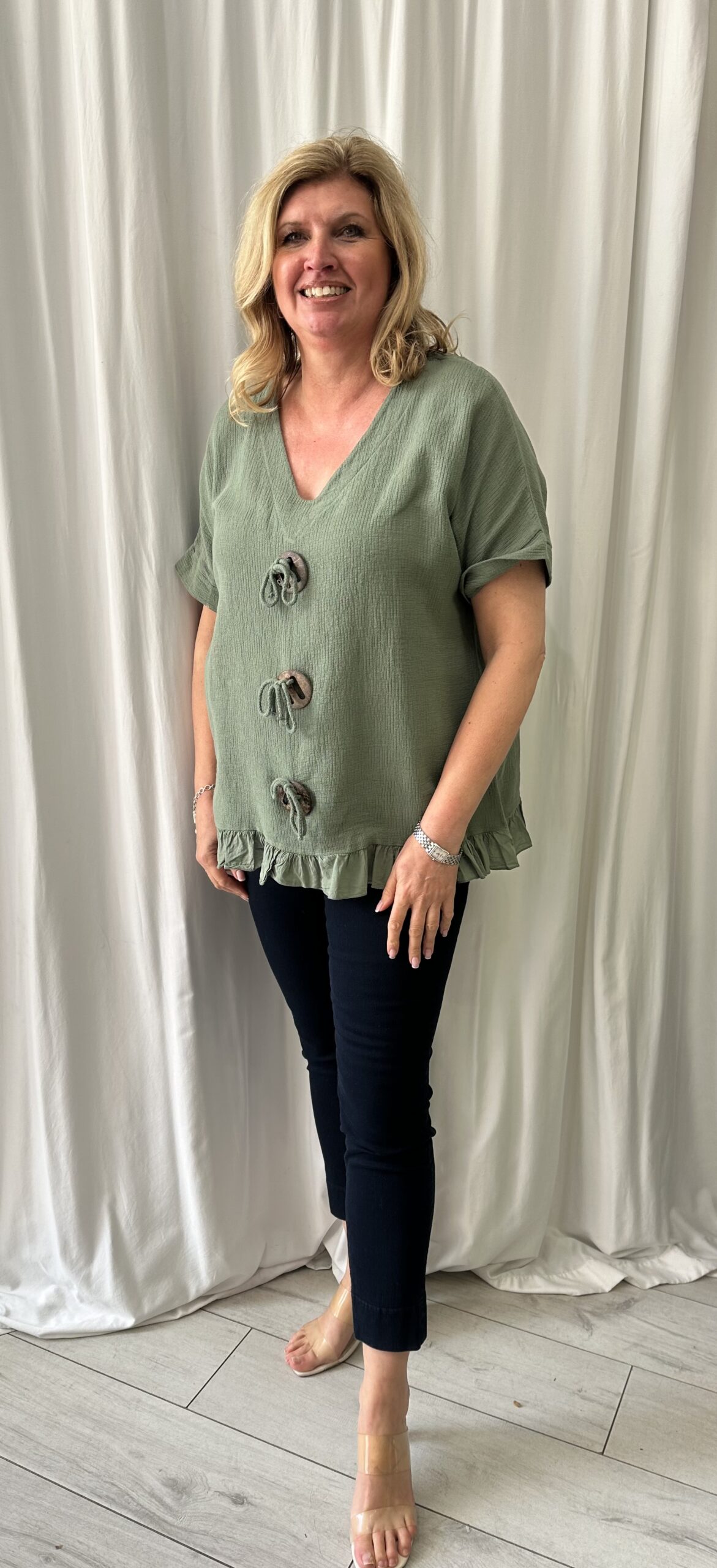 3 toggle buttons at the front with a frill hem