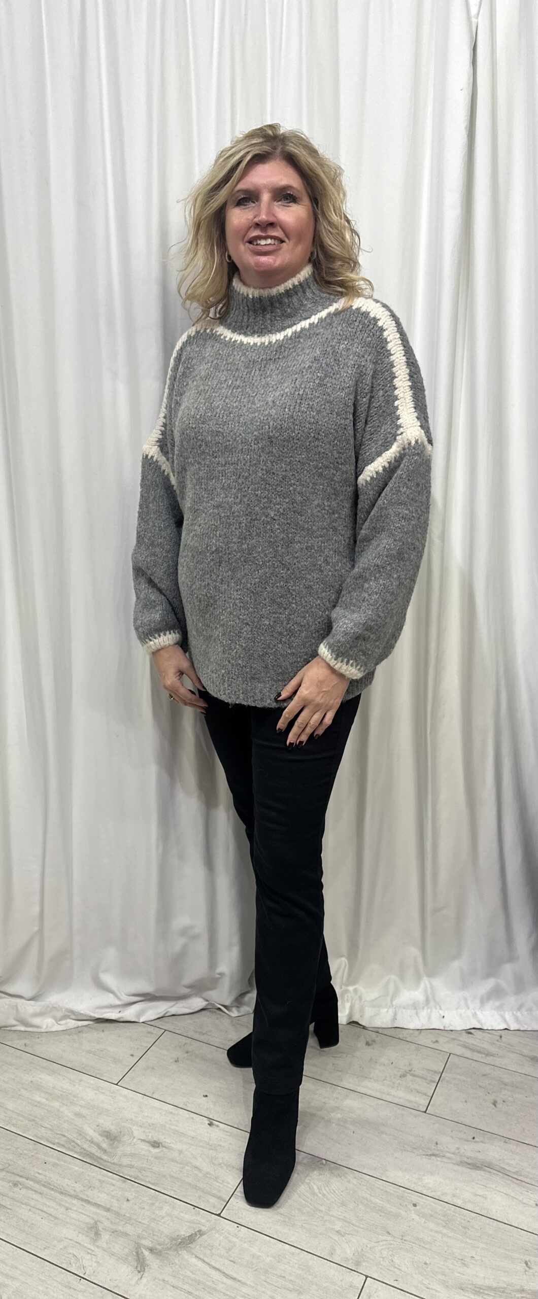 Dark Grey chunky jumper with contrast coloured stitching in Cream from our Italian Collection
