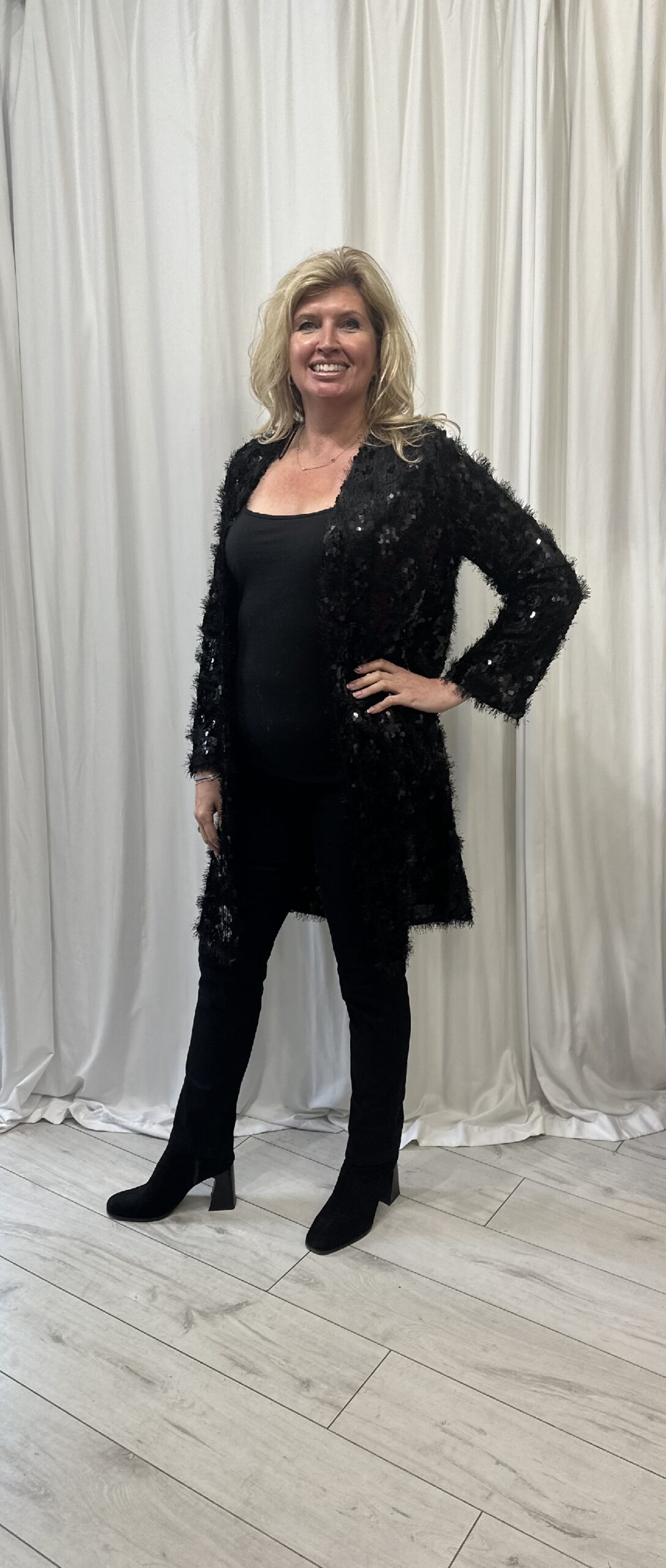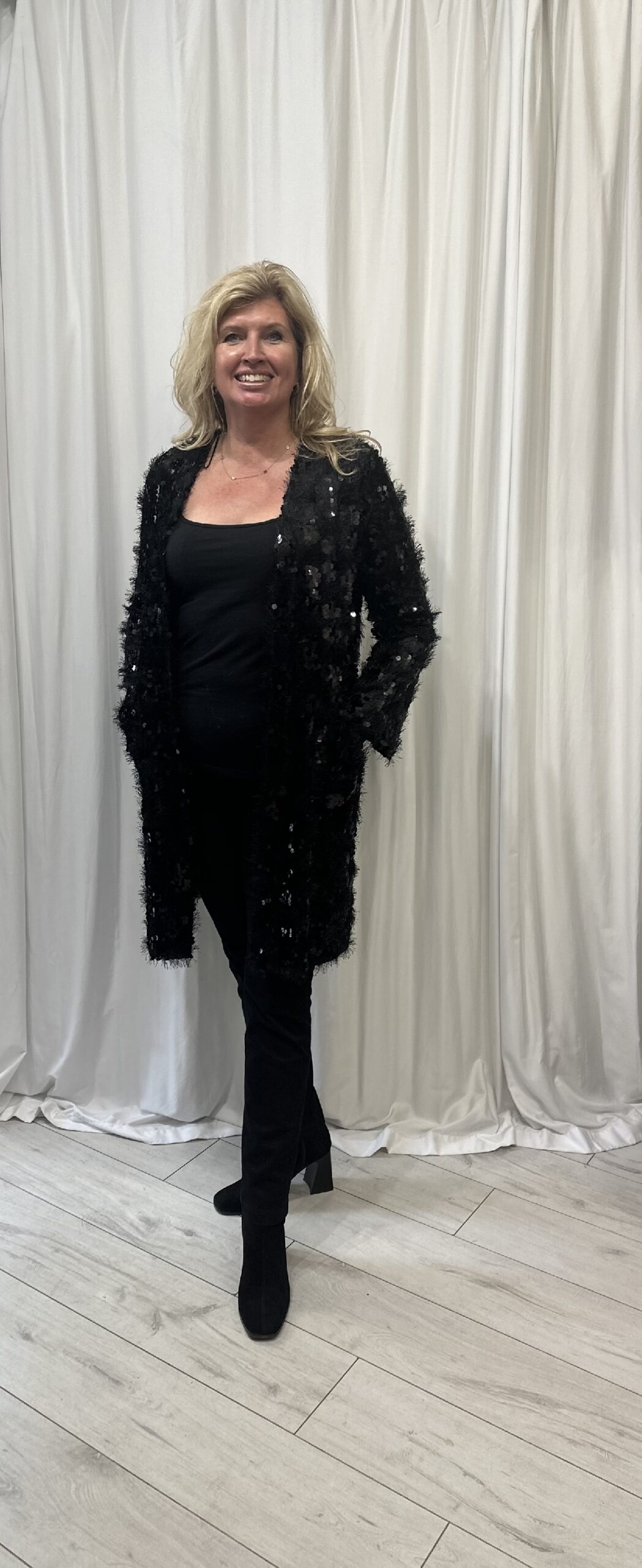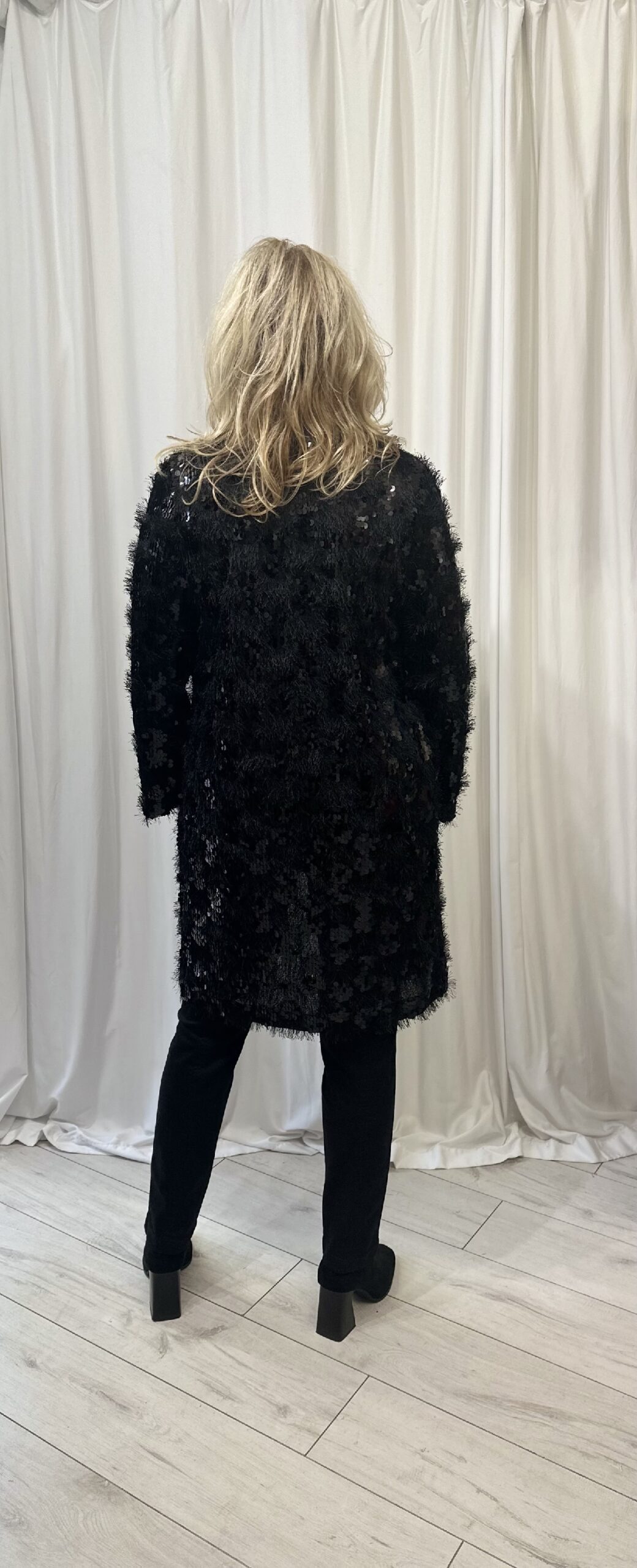 Long Sequin And Tassel Cardigan With Two Front Pockets In Black Size 12/14