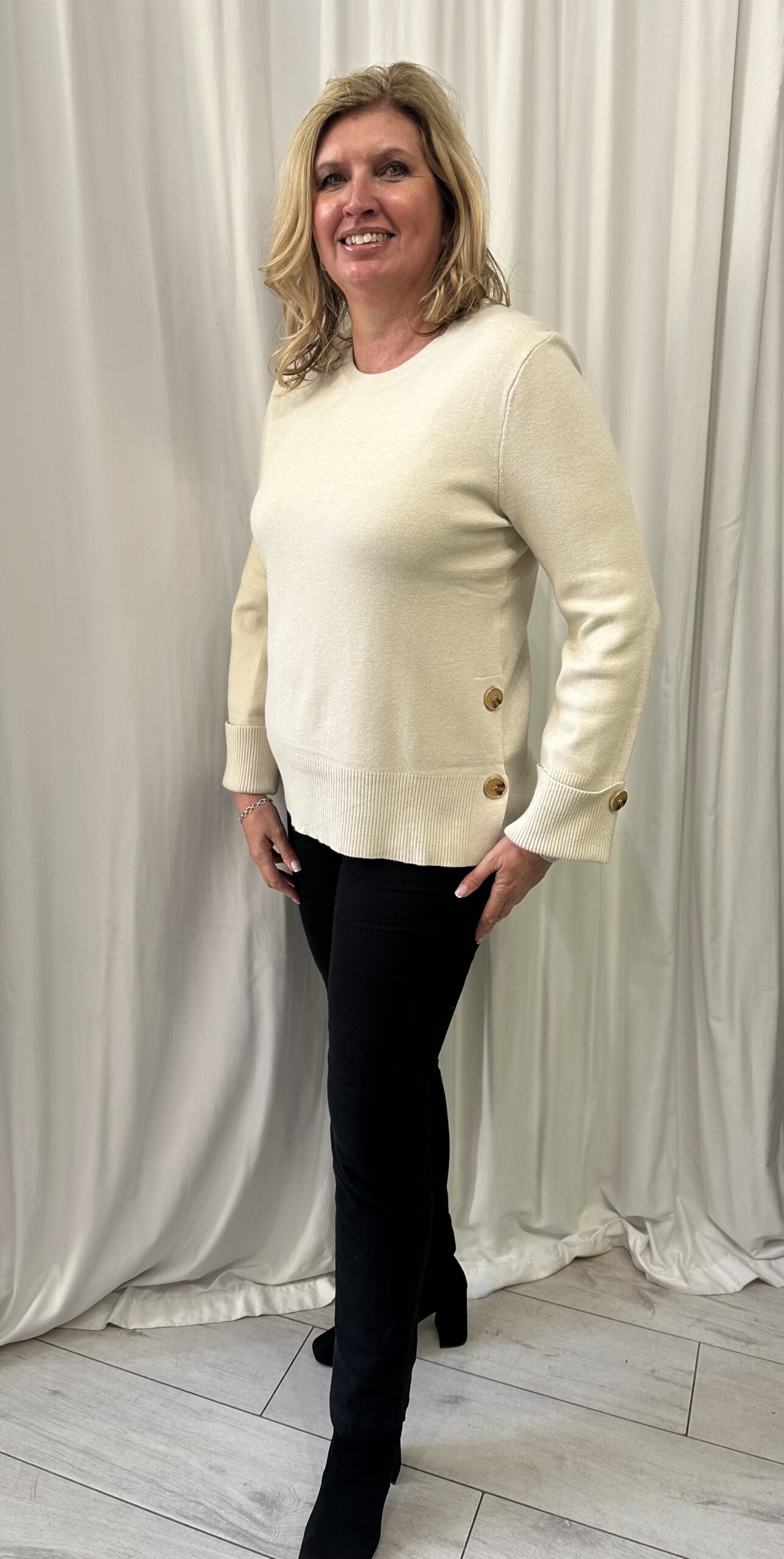Round Neck Jumper with Gold Buttons on the Sleeves & Sides