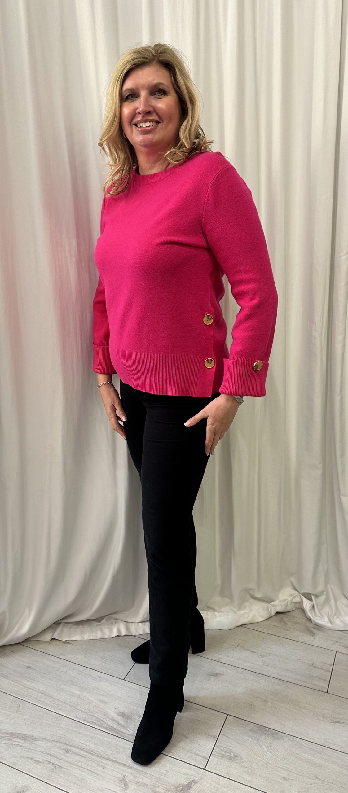 Round neck jumper with gold buttons on the sleeves & sides in Cerise