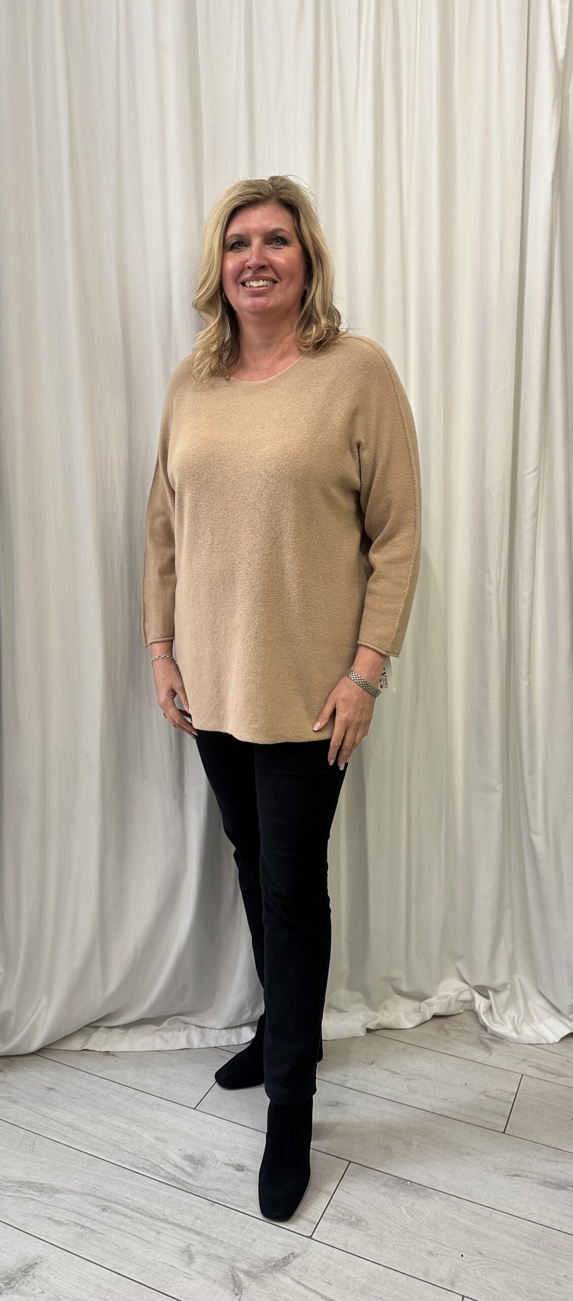 Round neck plain long jumper in Camel